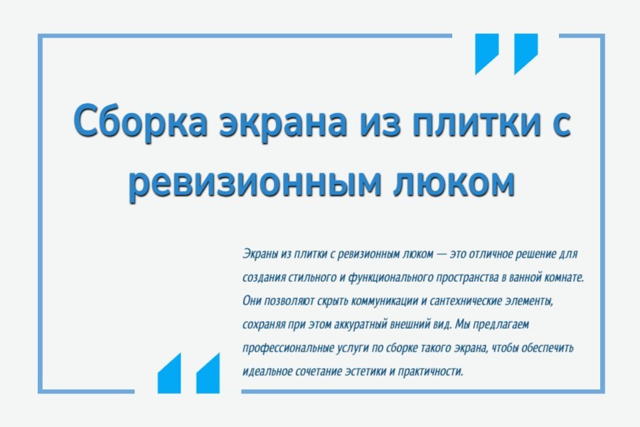 - Опыт и профессионализм: Наши специалисты имеют богатый опыт в сборке экранов из плитки с ревизионными люками, что гарантирует высокое качество выполнения всех работ.